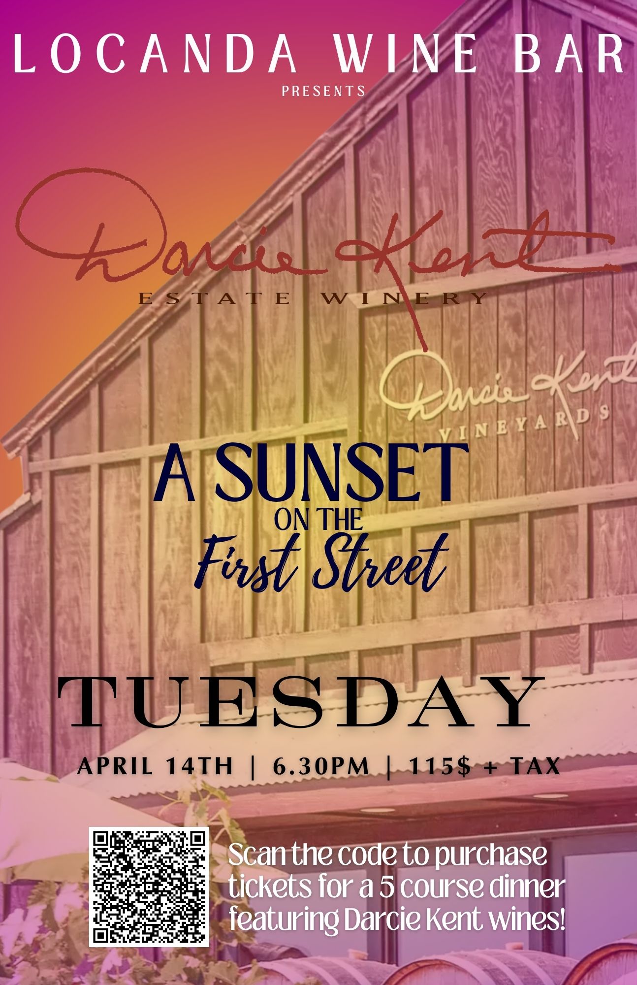 Golden hour, bottled. π π· Join us at Locanda Wine Bar for “A Sunset on First Street” — a five-course wine dinner featuring the expressive, estate-driven wines of Darcie Kent. As the evening unfolds, each course will be thoughtfully paired to capture the warmth, color, and character of Livermore at sunset — where every glass tells a story and every dish completes it. Five courses. Golden light. Unforgettable wines. Reserve your seat and meet us at sunset. πβ¨